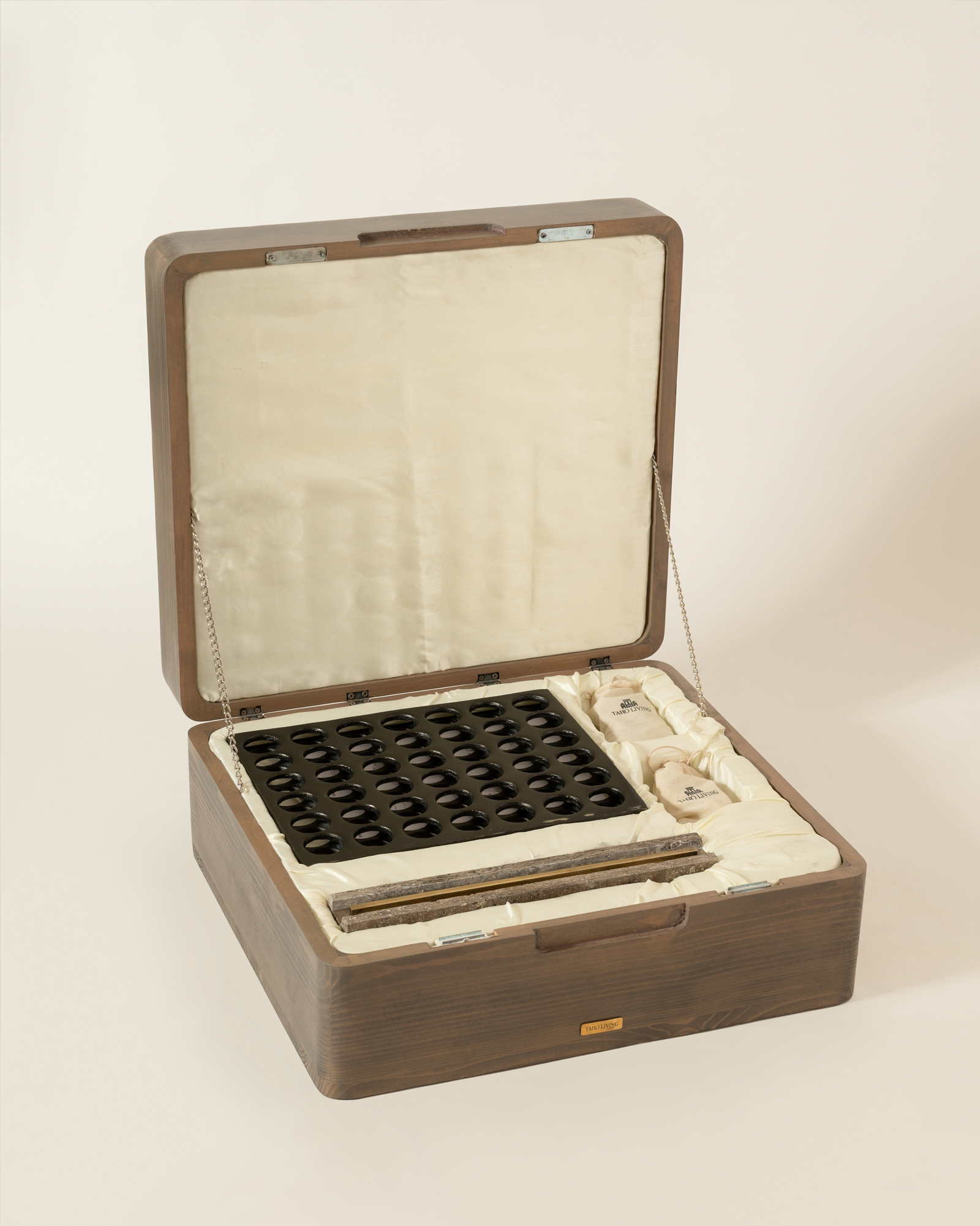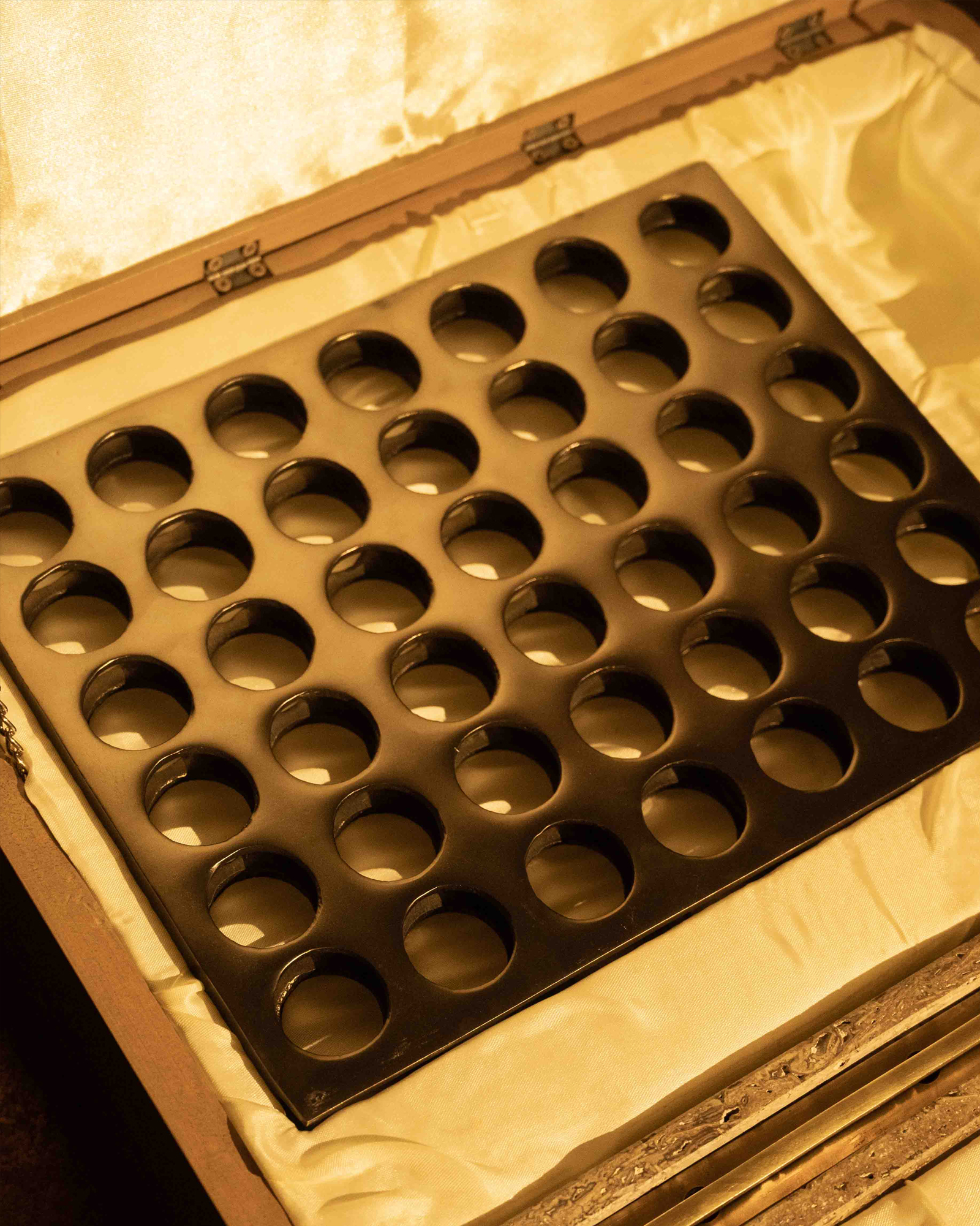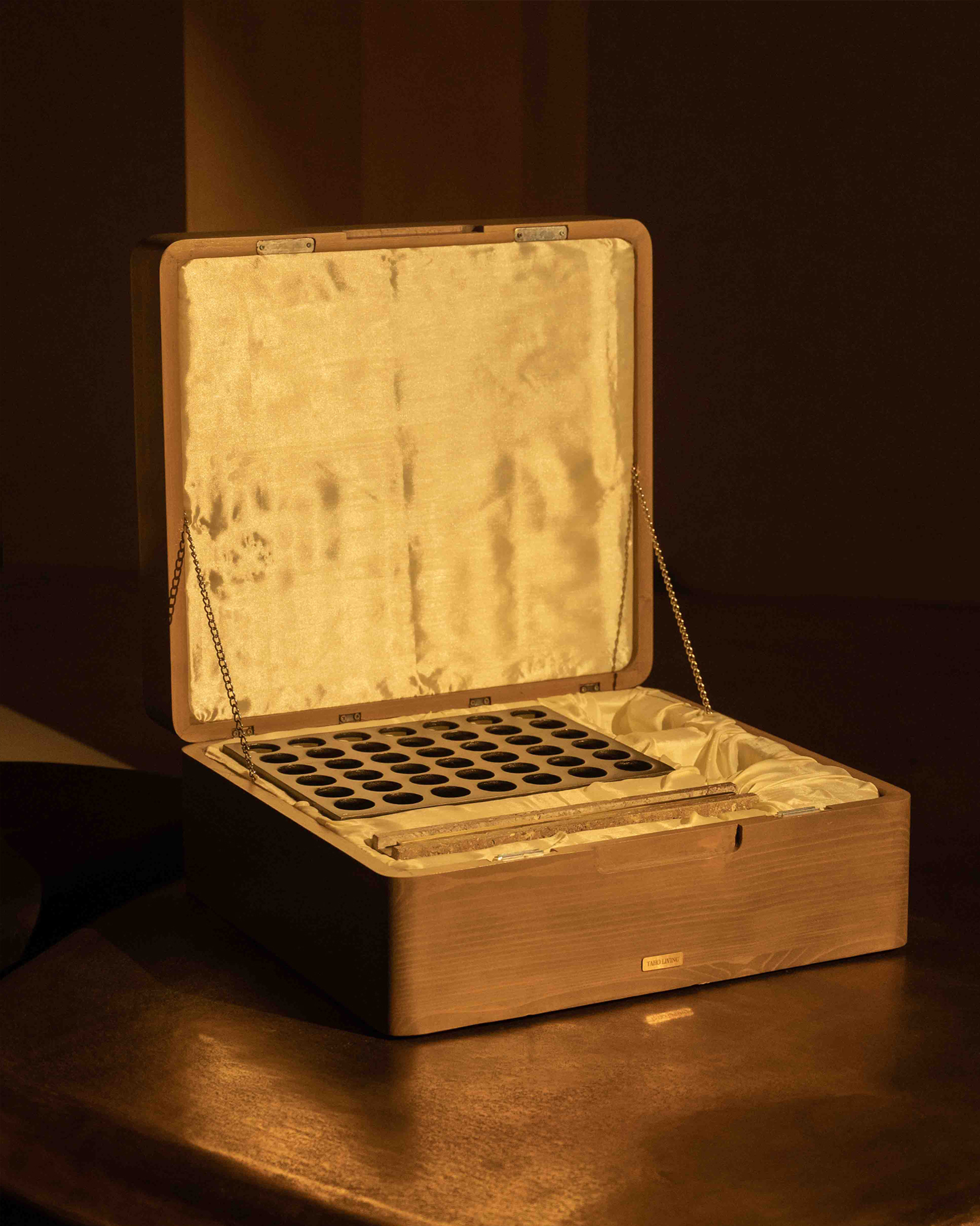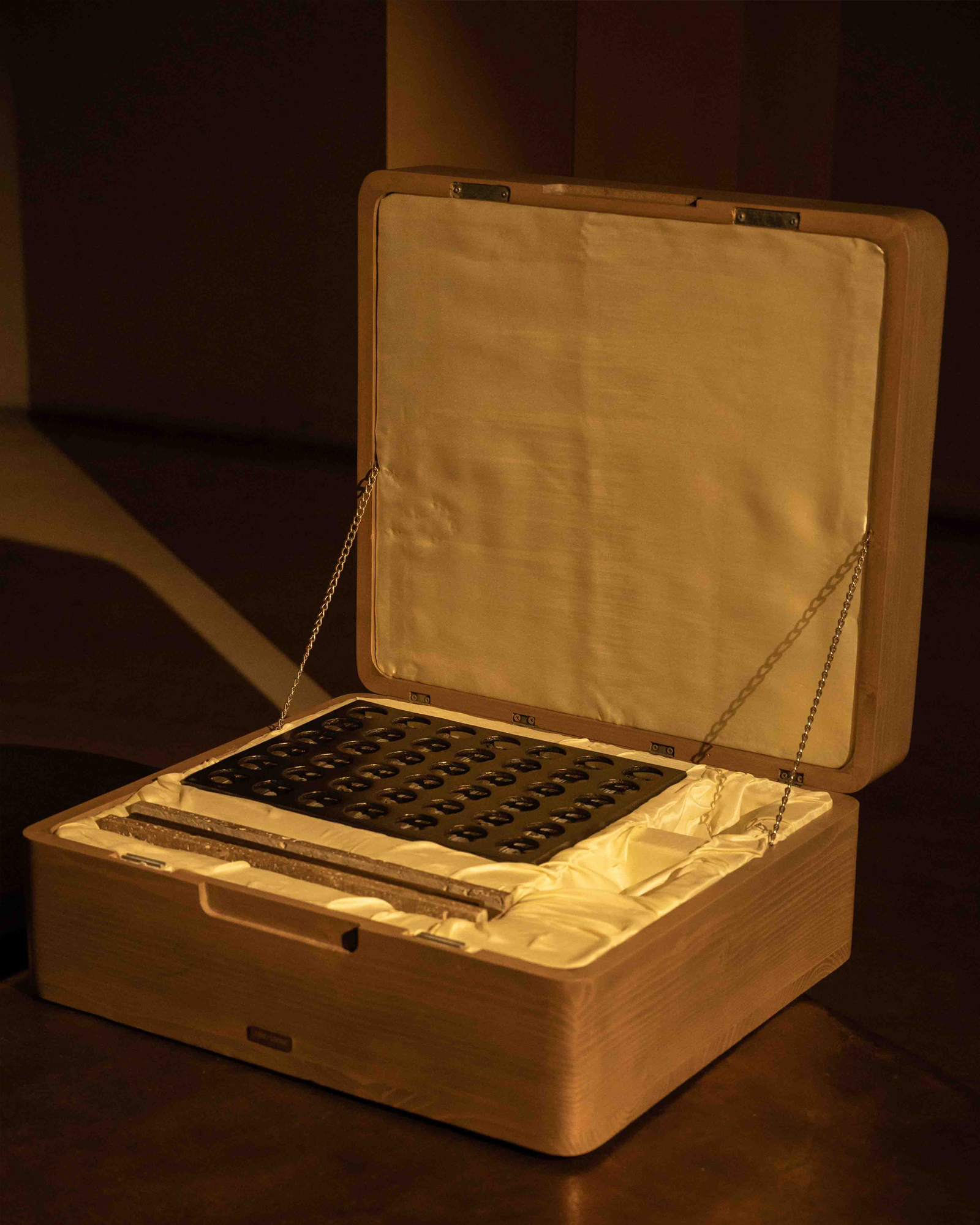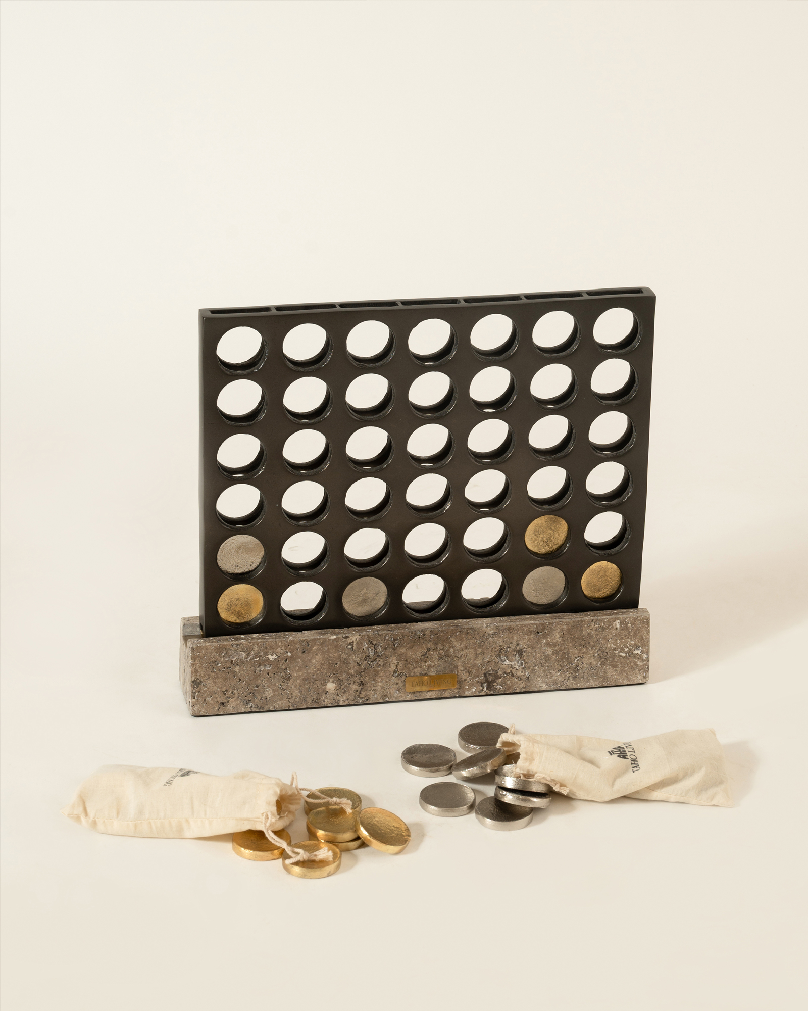 Alignment Four In A Row Game reimagines a familiar game as a sculptural object meant to be displayed as much as it is played. Cast aluminium forms the body, finished in black nickel, paired with coins layered in gold and silver tones. Set on a marble base with brass and iron detailing, it invites interaction while holding its place as a considered tabletop piece.
