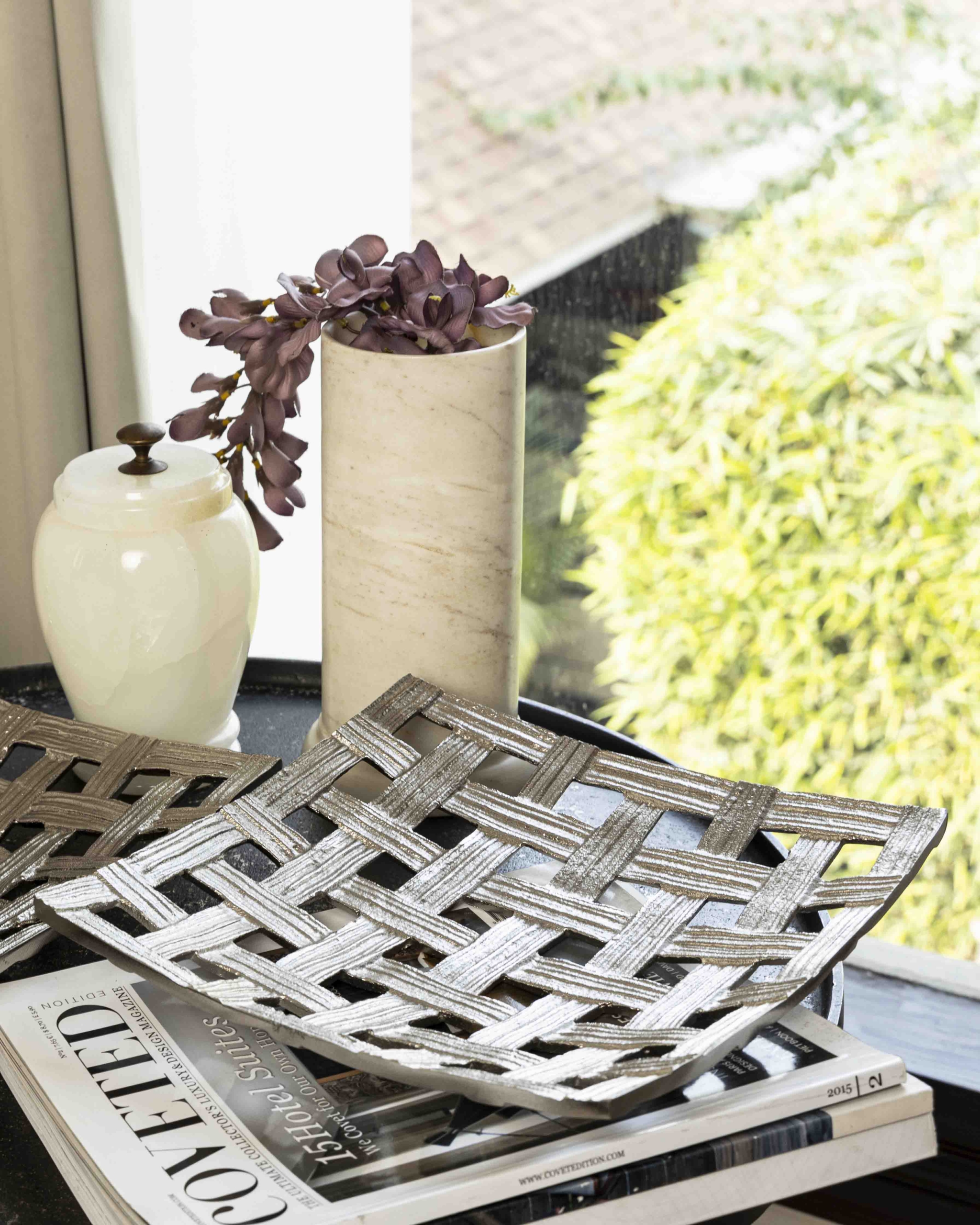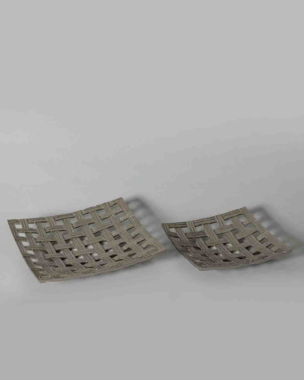 Completed in a nickel finish, the chequered perforations on our Filigrana platter potrays a classic knit pattern in ed aluminum adding a soft shine to it’s crinkled all-over texture.