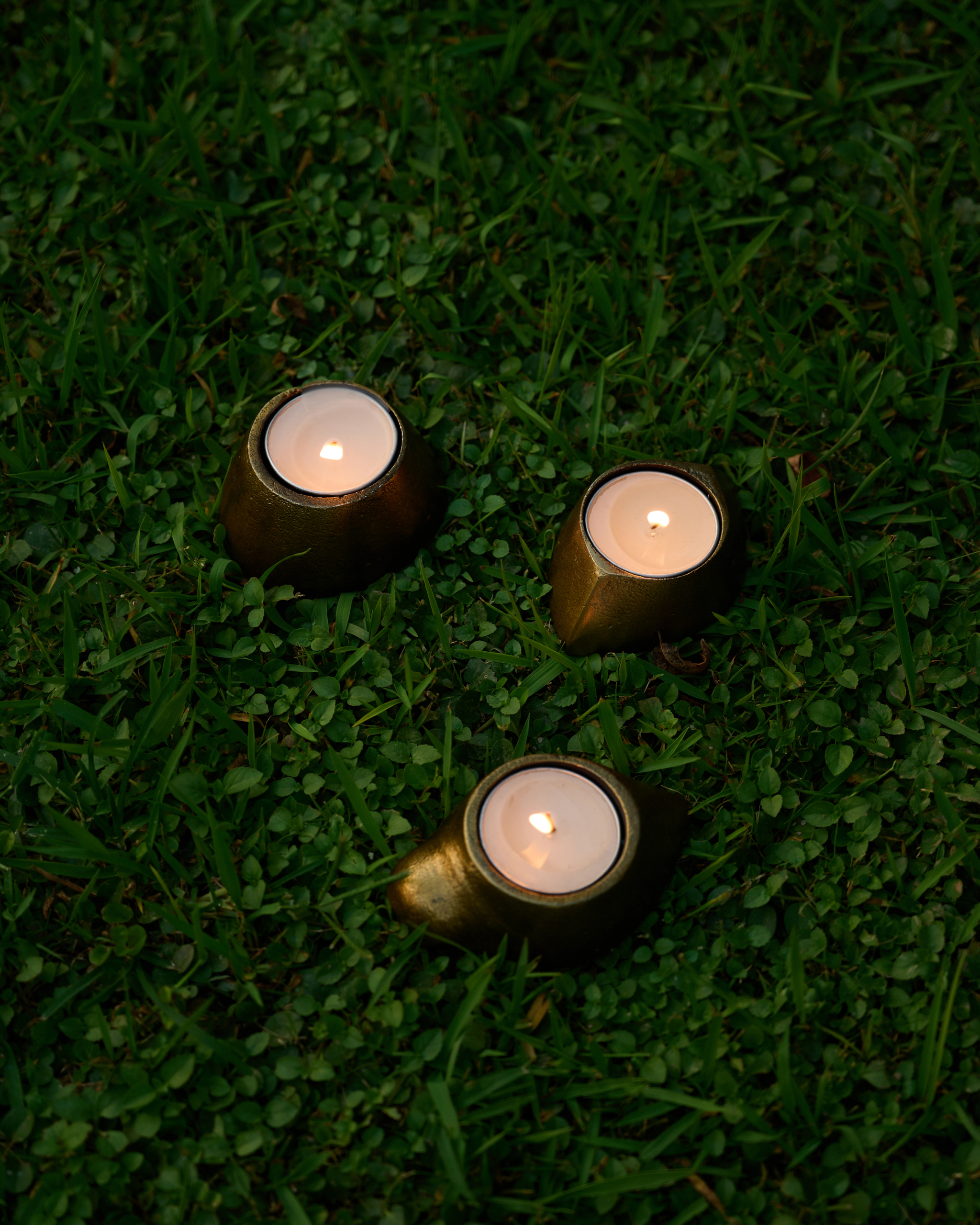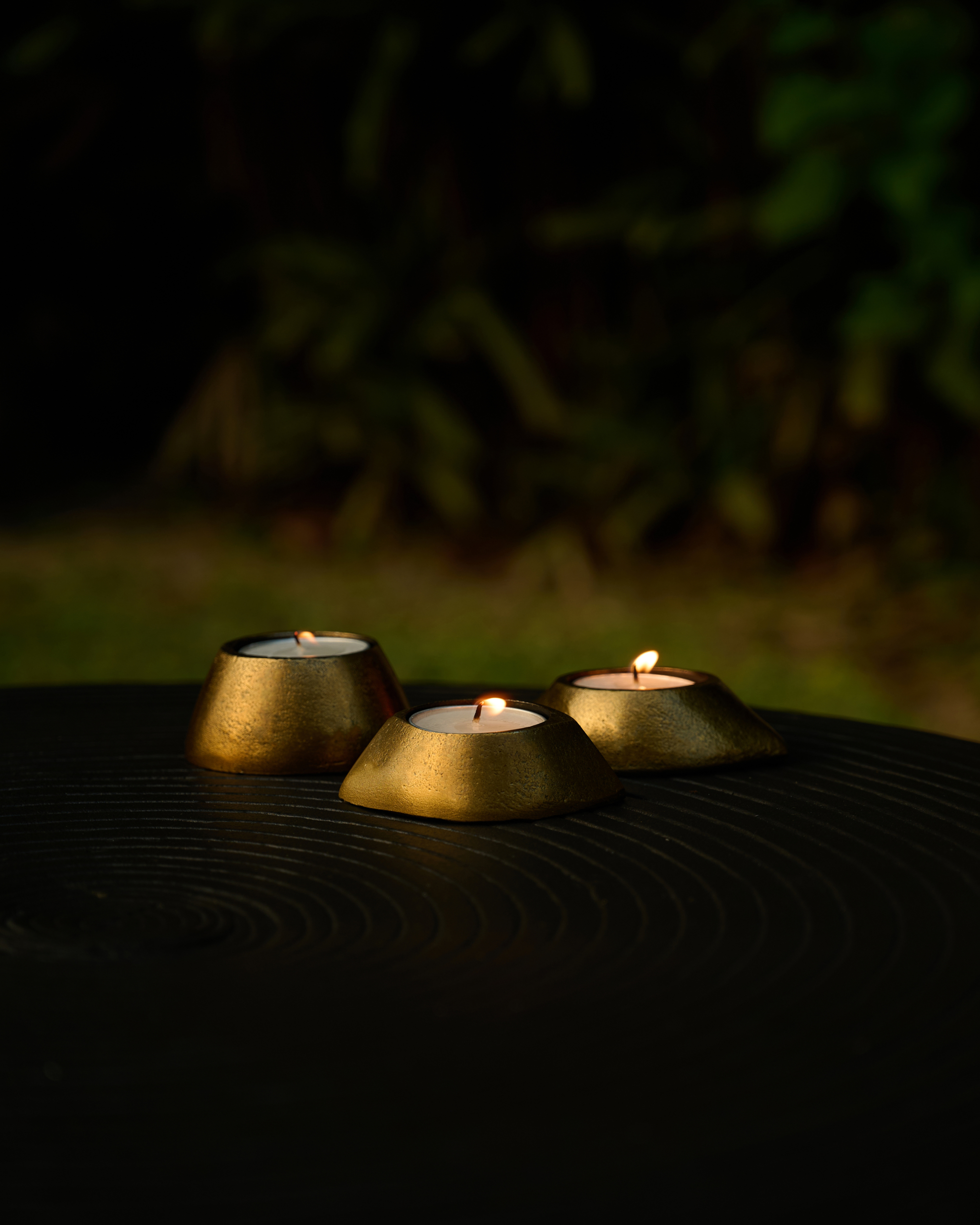Shop Leshya Tea Light Holders in cast aluminium with brass antique finish set of 3 handcrafted accents that bring a warm festive glow to any corner