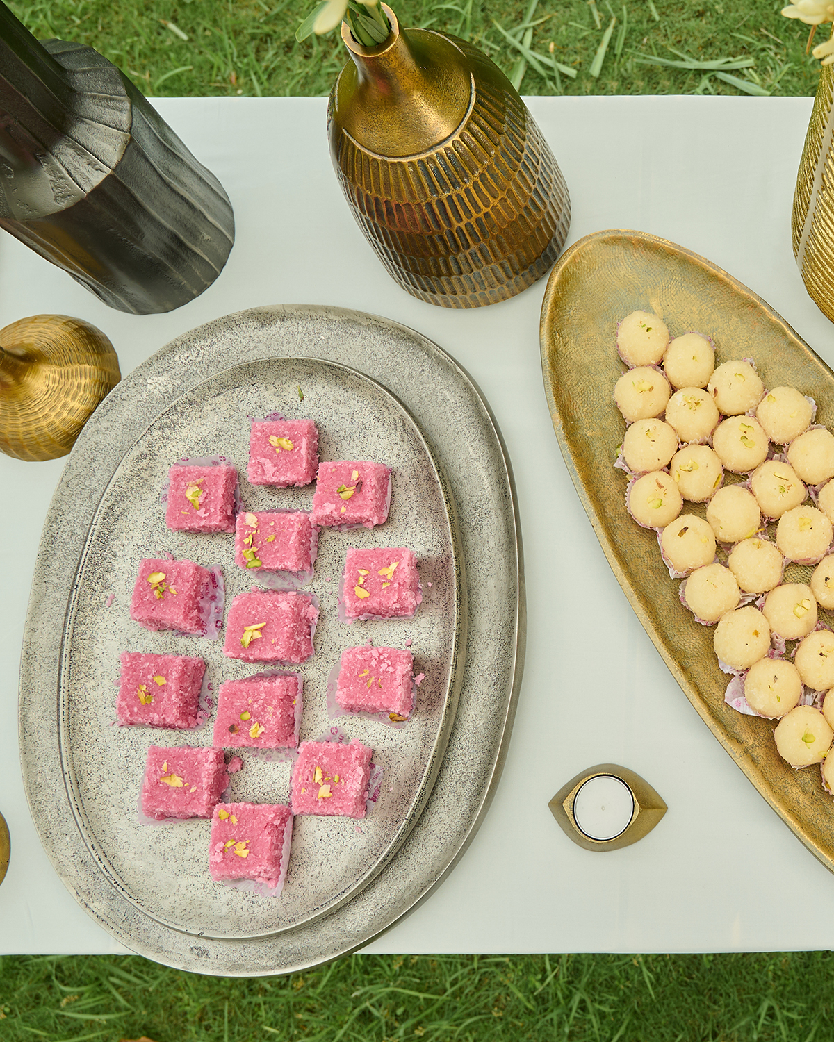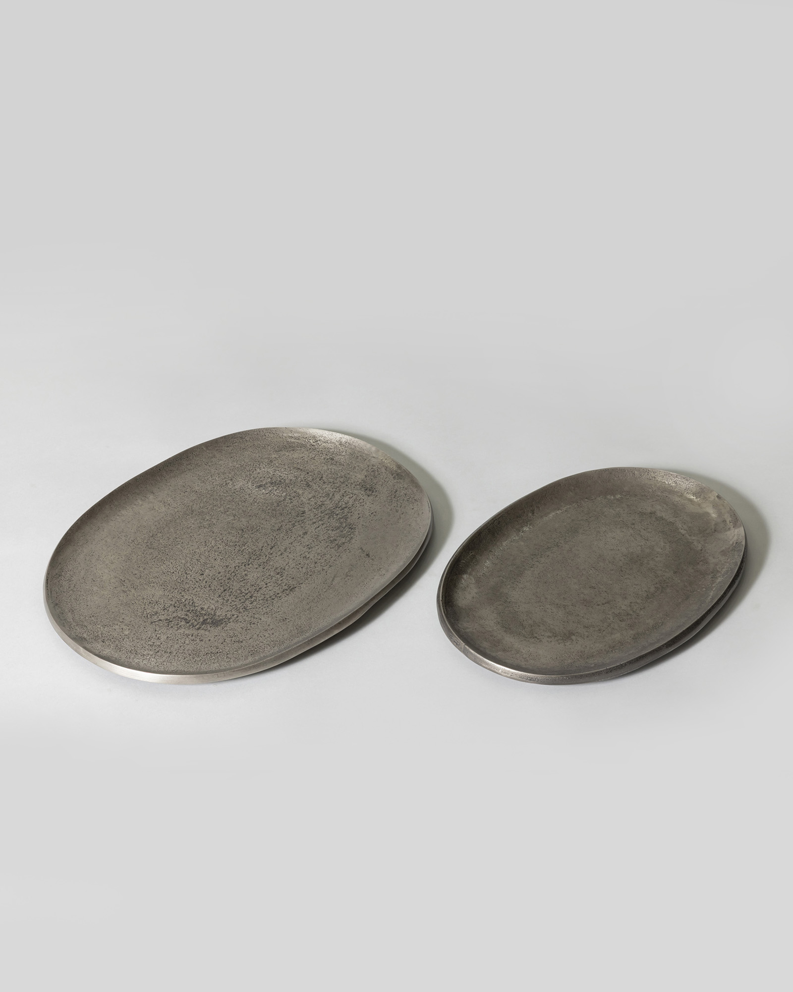 Shop Mati Trays in cast aluminium with antique nickel finish a pair of sleek versatile accents for serving gifting or styling luxury coffee tables