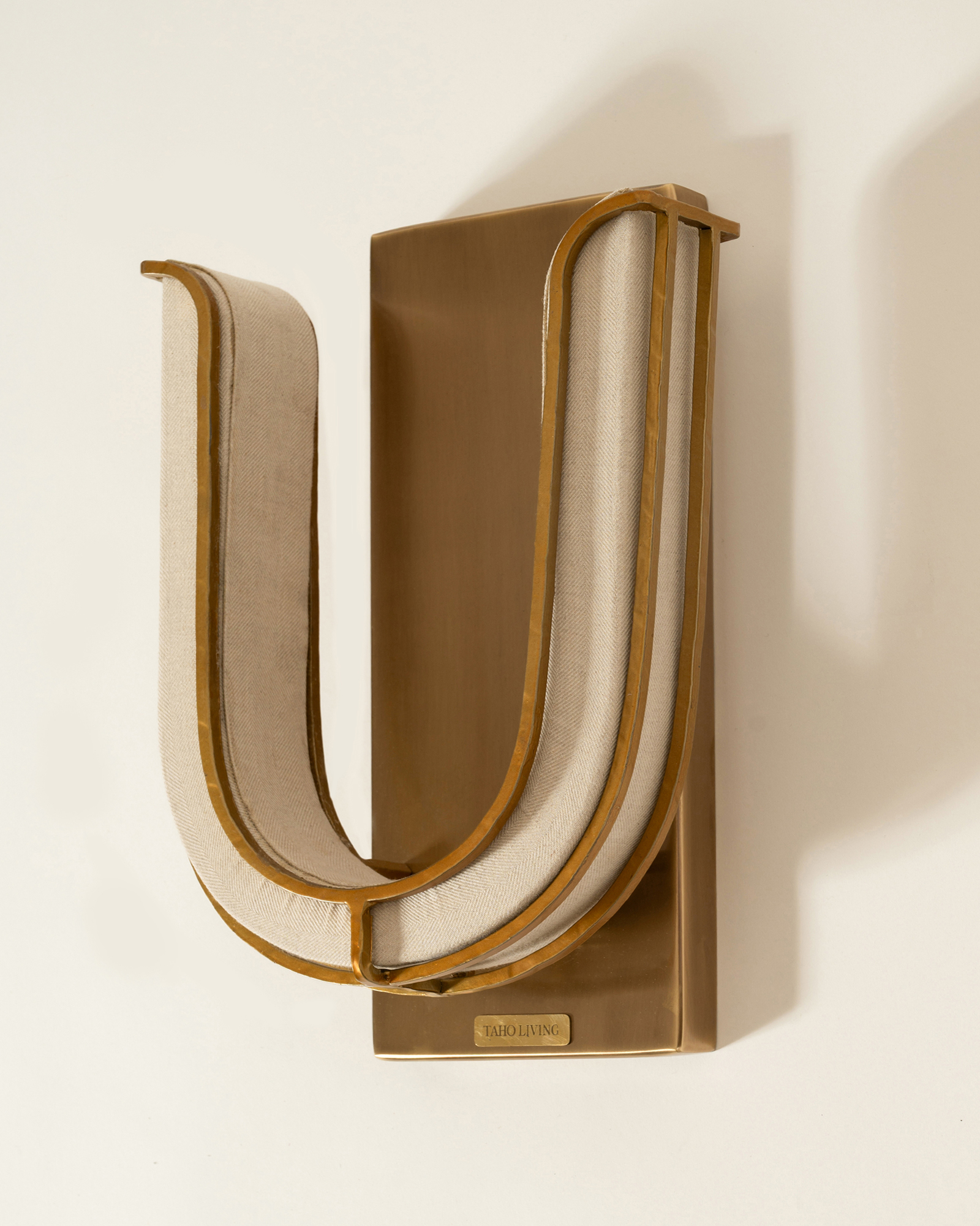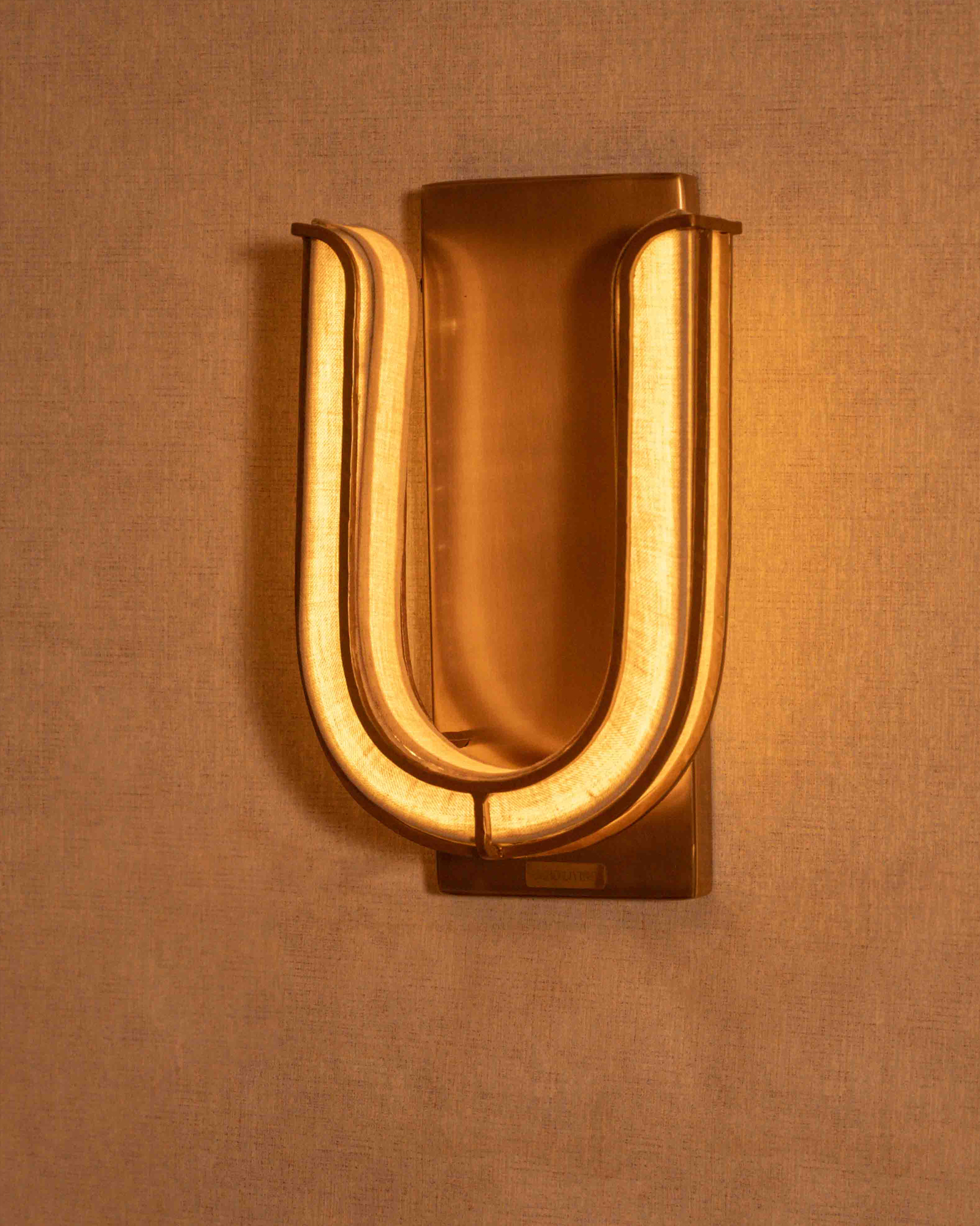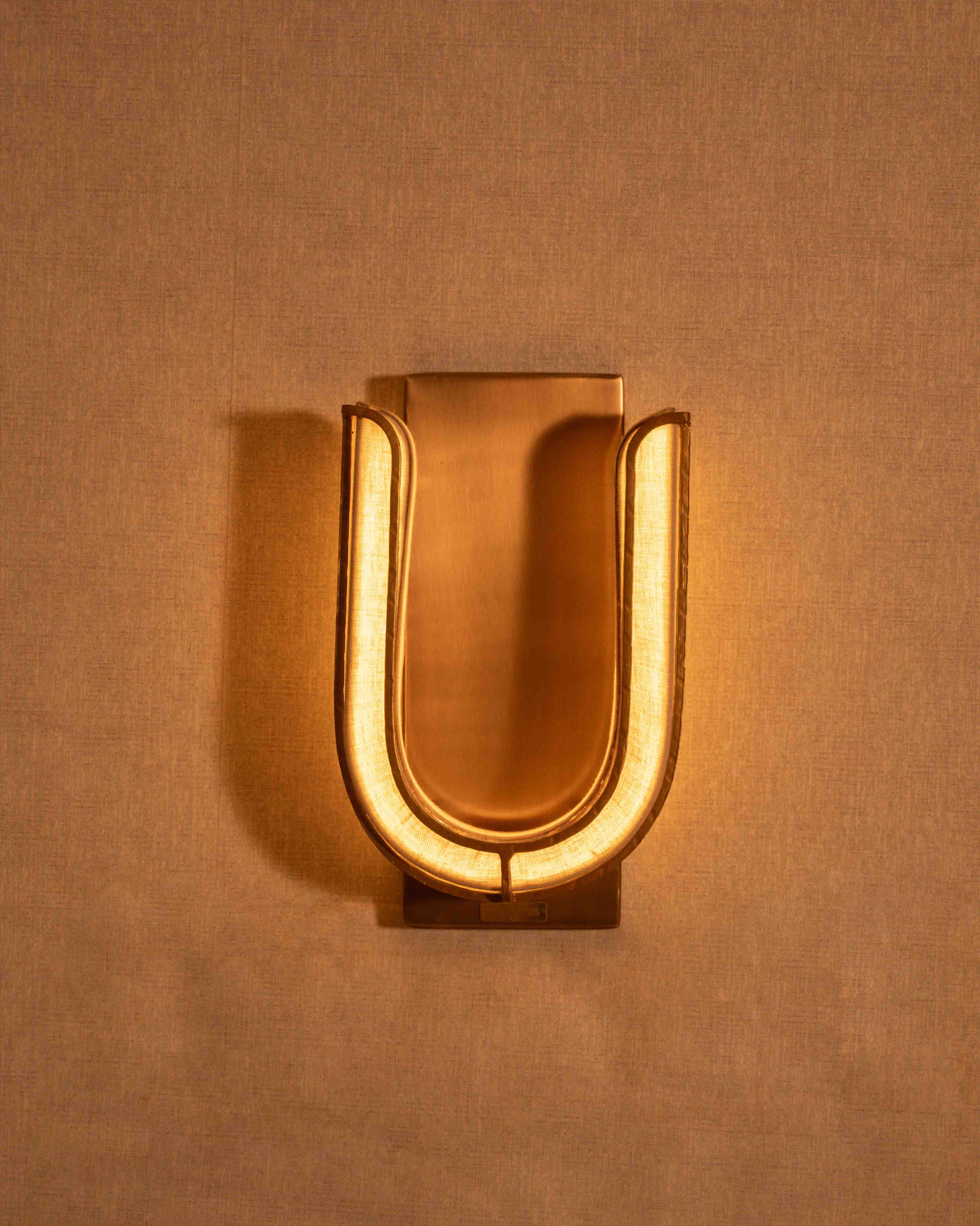 Qandil Wall Lamp is shaped as a sculptural curve, where a brass sheet is formed into a fluid U and held by forged iron with deliberate restraint. Finished in an antique patina, it casts light inward and outward, creating depth rather than glare. Designed to read as an object by day and an atmospheric presence once illuminated.